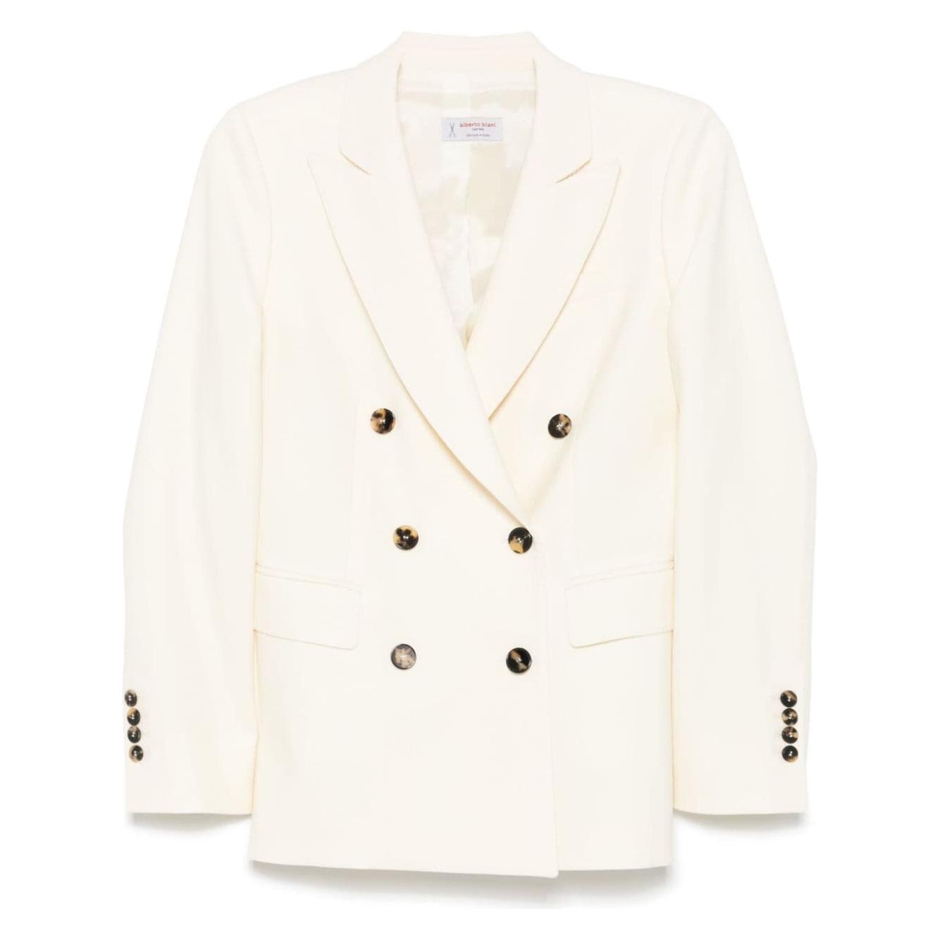 white virgin wool blend interlock twill weave double-breasted button fastening peak lapels shoulder pads long sleeves buttoned cuffs chest welt pocket two front flap pockets American rear vent full lining straight hem Wool double-breasted jacket Size and Fit - This piece fits true to size. We recommend you get your regular size. Model is 1,75m / 5ft 8in wearing size 40 (IT)