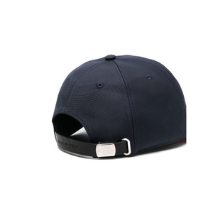 logo-print baseball cap from Alexander McQueen featuring navy blue, milk white, cotton, logo print to the front, leather strap and adjustable strap to the rear. Logo baseball cap