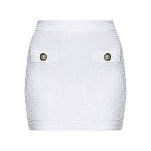white decorative button detailing faux-pocket detailing tonal stitching high waist Tweed mini skirt Size and Fit - This piece fits true to size. We recommend you get your regular size. Model is 1,75m / 5ft 8in wearing size 36 (FR)