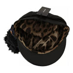 Dolce & Gabbana Black Leather Crystal Beads Gold Ribbon Fiddler Cap
