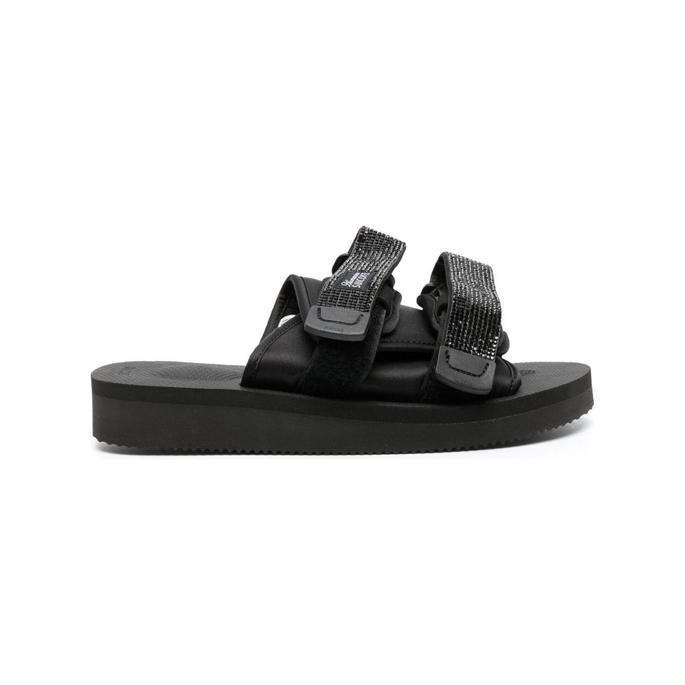 logo-patch touch-strap sandals from BLUMARINE featuring black, logo patch to the front, crystal embellishment, front touch-strap fastening, open toe and flat sole. Touch-strap sandals Size and Fit - Heel 1,2 in / 3 cm; Platform 0,8 in / 2 cm