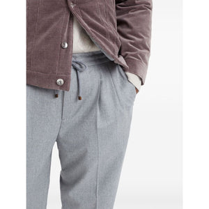 beluga grey virgin wool pressed crease elasticated drawstring waistband two side slit pockets two rear jetted pockets tapered leg Wool trousers