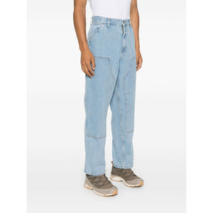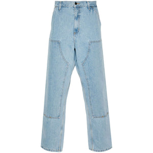 light blue cotton front button and zip fastening belt loops two diagonal pockets to the sides logo patch to the rear two rear patch pockets Double Knee denim jeans Size and Fit - This piece fits true to size. We recommend you get your regular size. Model is 1,84m / 6ft 1in wearing size 32 (WAIST CM)