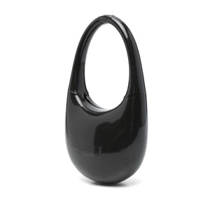 black open top embossed logo to the front single top handle Swipe shoulder bag Size and Fit - Depth 5 cm, Handle 16 cm, Height 13 cm, Width 17 cm