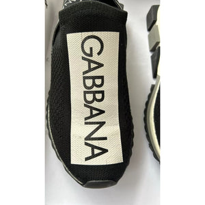 Gorgeous preowned, 100% Authentic Dolce & Gabbana Store sample Black and white ‘Sorrento’ sock sneakers. Decorated with a logo print in white and black. Fabric pull strap sewn-in at the back. Black decorative rubber sole.