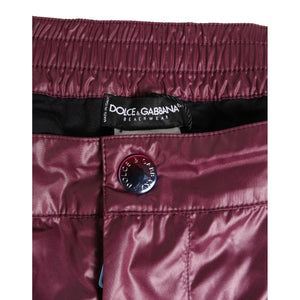 Dolce & Gabbana Burgundy Polyester Logo Embossed Crest Swimwear with glossy finish and embroidered crest. Crafted in Italy.