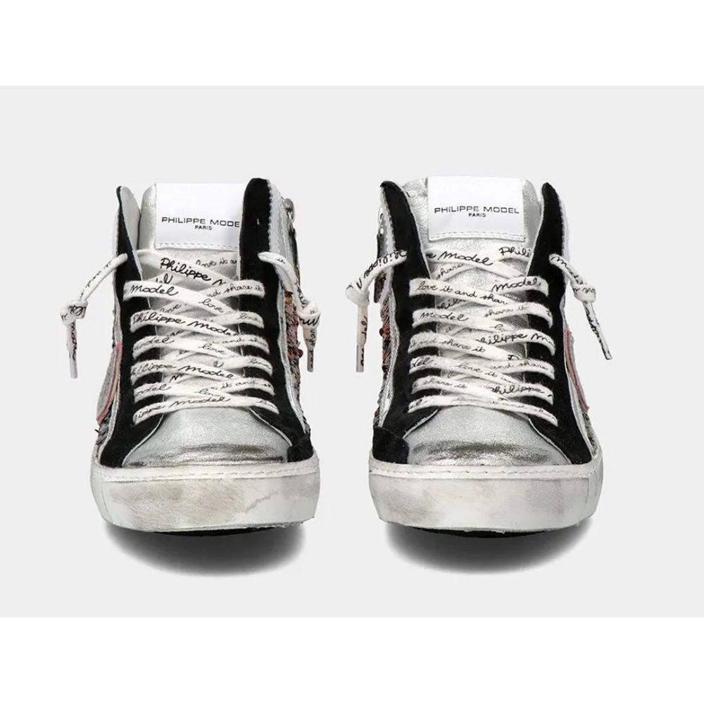 Philippe Model Elegant Gray Leather Sneakers with Sequin Details