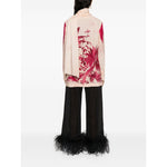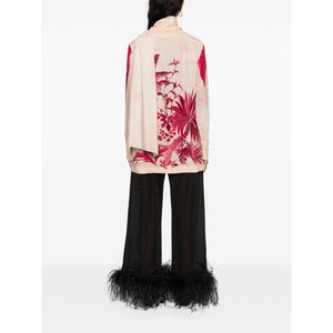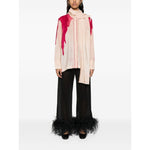 light pink silk palm tree print detachable long scarf band collar concealed front button fastening long sleeves buttoned cuffs side slits straight hem Printed crepe de chine shirt Size and Fit - This piece fits true to size. We recommend you get your regular size. Model is 1,75m / 5ft 8in wearing size S