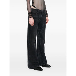 black cotton denim whiskering effect at the thighs belted waist frayed edge front press-stud and zip fastening flared two side inset pockets two rear patch pockets straight hem long length Wide-leg denim cotton jeans Size and Fit - This piece fits true to size. We recommend you get your regular size. Model is 1,75m / 5ft 8in wearing size 27 (WAIST CM)