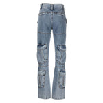 light blue cotton denim panelled design silver-tone logo plaque belt loops concealed front fastening bootcut two side slit pockets two front welt pockets multiple cargo pockets two rear welt pockets straight hem Cargo denim cotton jeans Size and Fit - This piece fits true to size. We recommend you get your regular size. Model is 1,75m / 5ft 8in wearing size 27 (WAIST CM)