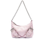 blush pink calf leather grained texture curve-edge body chain-link shoulder strap decorative buckle detailing debossed logo to the front main compartment internal logo patch full lining logo-engraved silver-tone hardware top zip fastening This piece comes complete with a protective dust bag. VoYou leather shoulder bag Size and Fit - Width 9,84 in / 25 cm