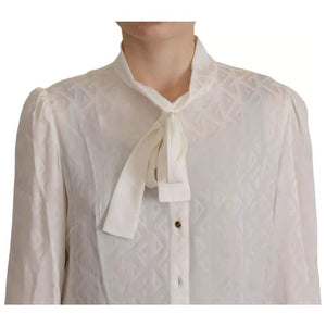 Dolce & Gabbana White Patterned Silk Ascot Collar Blouse Top