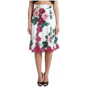 Dolce & Gabbana White Rose Print High Waist Midi A-line Skirt